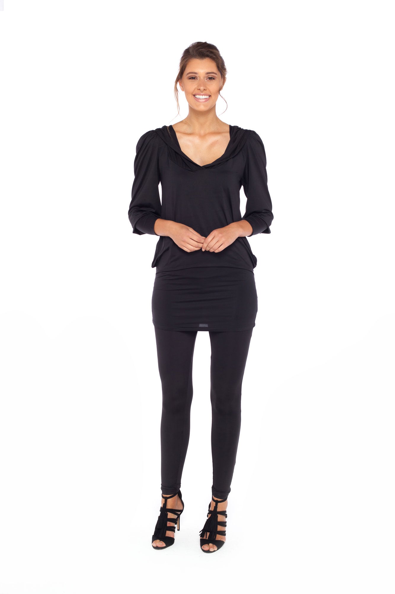 Featuring an oversized draped hood to the back and a shawl style neckline to the front, the Shawl-Collared Hooded Tunic's soft silk jersey glides easily over the body, creating a blouson effect over the torso to where she hugs the hips. Balancing the volume of her hood, gathered, leg-of-mutton sleeves drape the upper arms, the stretch of their jersey drawing them in elegantly over the forearms.