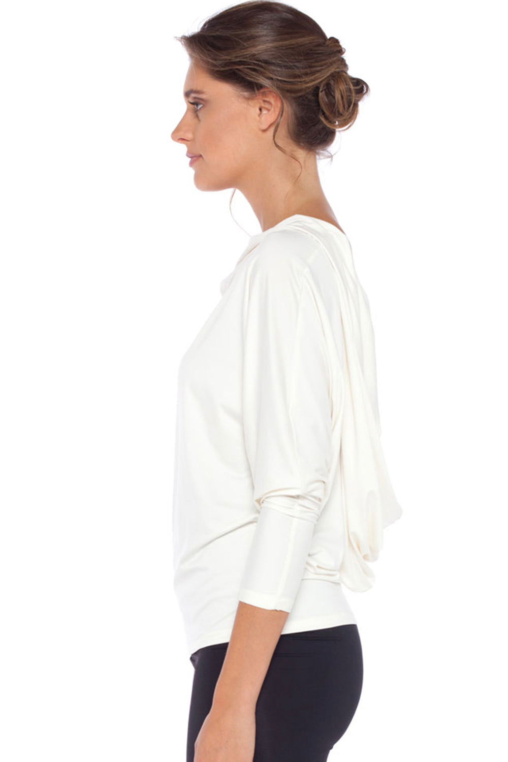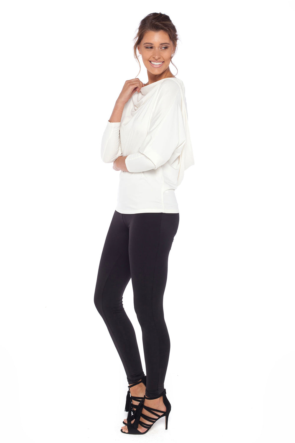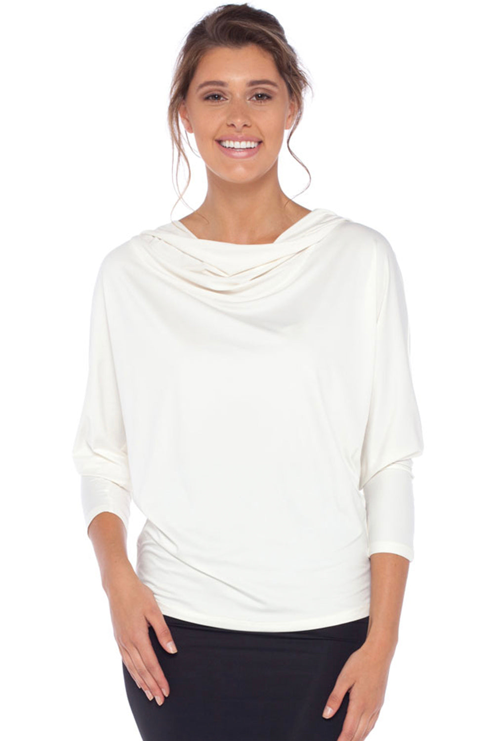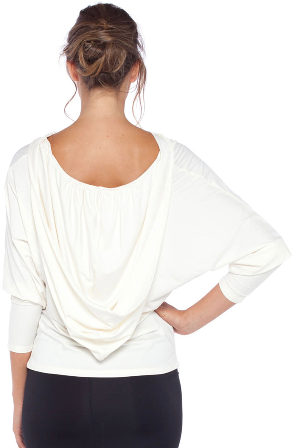 The Batwing Hooded Top’s cowl neckline sits high to the front while the oversized hood falls elegantly down the back.